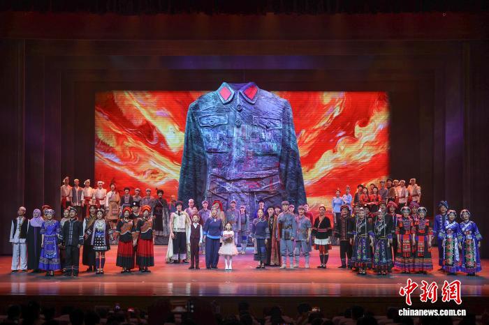 圖為9月23日,原創(chuàng)民族歌舞劇《五彩紅軍衣》首演現(xiàn)場。劉力鑫 攝 在開幕式上,本屆文藝展演精心打造的原創(chuàng)民族歌舞劇《五彩紅軍衣》進(jìn)行了首演。該劇由大型紅色文旅史詩《長征第一渡》原班導(dǎo)演團(tuán)隊編創(chuàng)。 劇目緊緊圍繞鑄牢中華民族共同體意識主線,傳承紅色基因,融匯民族特色,將長征精神與鑄牢中華民族共同體意識創(chuàng)造性結(jié)合,打造“七個一”表現(xiàn)形式(一條長征路、一套舊軍裝、一支洗衣隊、一片愛國心、一捧石榴籽、一曲軍民魚水情贊歌、一部民族團(tuán)結(jié)史詩),通過紅星、紅旗、紅軍等元素和形象,彰顯紅軍與少數(shù)民族鄉(xiāng)親的魚水深情。 記者獲悉,相較于往屆,本屆文藝展演立足江西民族文藝實際和長征紅色基因優(yōu)勢,打造出三大獨(dú)特亮點(diǎn),一是紅的底色與民族特色交匯融合,彰顯地域辨識度;二是靜態(tài)展示與動態(tài)展演交相輝映,豐富活動體驗感;三是藝術(shù)展演與實踐成果交融互鑒,突出民族時代性。