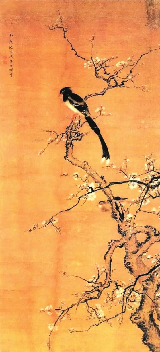 宋代畫(huà)家筆下的梅花大都與禽鳥(niǎo)有所關(guān)聯(lián),這主要得益于花鳥(niǎo)畫(huà)在此時(shí)的繁盛之勢(shì)。宋徽宗趙佶的《臘梅山禽圖》就把梅花與白頭翁聯(lián)系起來(lái),描繪了在乍暖還寒的季節(jié)里,兩只相伴而生的白頭翁立于臘梅枝頭的場(chǎng)景,給觀者帶來(lái)復(fù)蘇之感。作品左下角題詩(shī)“山禽矜逸態(tài),梅粉弄輕柔。已有丹青約,千秋指白頭”,表達(dá)了愛(ài)情之思。因?yàn)榘最^翁在傳統(tǒng)文化中象征吉祥與幸福,是對(duì)白頭偕老的隱喻,當(dāng)它與梅花結(jié)合起來(lái)時(shí),便會(huì)強(qiáng)化人們對(duì)美好愛(ài)情的聯(lián)想。