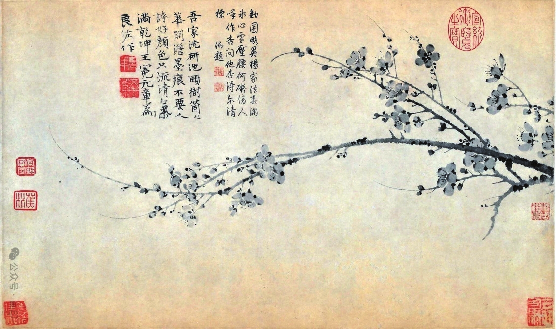 王冕《墨梅圖》是元代梅花題材繪畫(huà)的代表作,既展現(xiàn)了文人的傲然風(fēng)骨,亦革新了北宋以來(lái)的梅花筆法。與眾多畫(huà)家筆下的“官梅”相比,王冕更喜愛(ài)以“野梅”入題,這或許因?yàn)椤耙懊贰钡娘L(fēng)骨更為突出,也更能寄托畫(huà)家對(duì)自由的追逐。王冕筆下的墨梅擺脫了枯燥外形與彎曲枝蔓的束縛,彰顯不凡的氣度與精神。清人朱方靄在《畫(huà)梅題記》中說(shuō):“宋人畫(huà)梅,大都疏枝淺蕊,至元煮石山農(nóng)(王冕的號(hào))始易以繁花,千叢萬(wàn)簇,倍覺(jué)豐神綽約,珠胎隱現(xiàn),為此花別開(kāi)生面?!?/p>