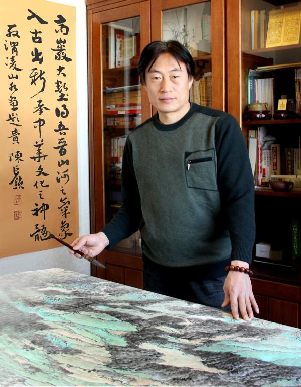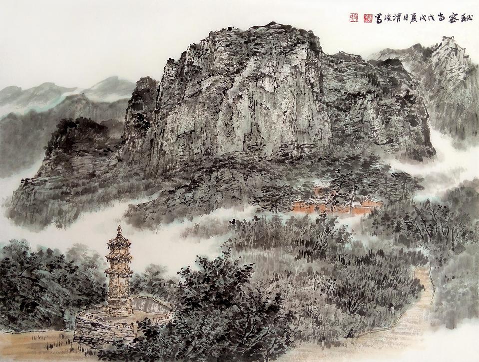 認(rèn)識(shí)殷渭凌,是先認(rèn)識(shí)他的畫,前幾年在一次省里畫展上看到了一幅山水畫,淳樸、厚重,樸實(shí)的親切、厚重的實(shí)在,完全沒有近幾年流行的風(fēng)氣,也沒有長期臨摹傳統(tǒng)繪畫形成的習(xí)氣。正如一個(gè)從鄉(xiāng)村走出來的小伙,健康、有朝氣、單純、樸實(shí)、憨厚、怯生生的站在那里,給我留下了很深的印象。因?yàn)樾弥莸貐^(qū)畫山水的人不多,很快就認(rèn)識(shí)了渭凌。果然人如其畫,淳樸、厚道、話不多、為人真誠,是個(gè)畫畫肯下功夫的小伙子。后來省美協(xié)山水畫藝委會(huì)的活動(dòng)都有他的身影,畫越畫越多,畫的也越來越好,但是畫面中那種親切、樸實(shí)、厚重、蒼茫的特點(diǎn)卻一點(diǎn)兒也沒有丟失。濃濃的泥土氣息生發(fā)于筆墨中,散發(fā)在畫面里,在展廳里感染著每一個(gè)觀眾。晉西北風(fēng)情在他的營造下得到了充分的體現(xiàn)。