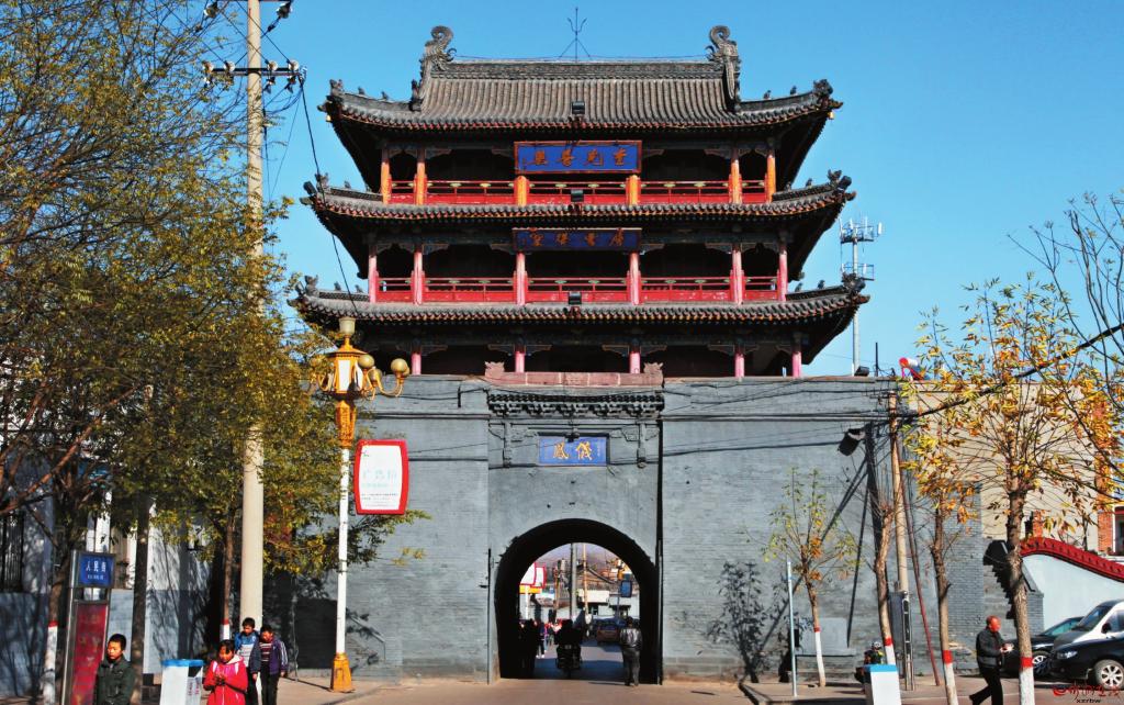 地處府城中心的鼓樓,是府城的最高建筑。明成化年間(1465年——1487年)建成,清光緒十七年(1891年)重修。鼓樓通高20米,磚石結(jié)構(gòu)臺基,上有三層建筑。鼓樓的奇特之處是底層磚碹洞是十字洞,東西南北四面皆通。東西兩個洞使七百戶街保持直通,成為寧武府城最長最寬的街。南北兩洞延伸,將頭百戶、三百戶、五百戶、九百戶幾條街連成一片,既便于排水,又方便出行。西門刻“鳳儀”,東門刻“含陽”,下題“光緒辛卯圜郡重建”。磚洞以上是三層木結(jié)構(gòu)建筑,面寬五間,進(jìn)深四椽,四周圍廊,檐柱間設(shè)雀替。三重檐歇山頂,一重檐下東西設(shè)隔扇門,其余為墻體。二、三重檐下東西面懸匾,東為“樓煩重鎮(zhèn)”“毓秀鐘靈”,西為“奎光普照”“層霄聳翠”。鼓樓為省級文物保護單位。
