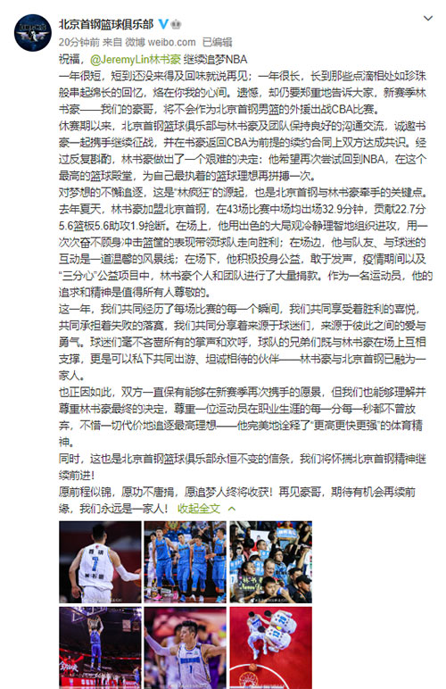 人民網(wǎng)北京9月15日電(楊喬棟)15日,林書豪通過個人社交平臺發(fā)布自制視頻宣布,下個賽季將不再代表北京首鋼男籃征戰(zhàn)CBA賽場,而將繼續(xù)尋求征戰(zhàn)美國職業(yè)籃球聯(lián)賽的機會。林書豪在視頻中稱,最近四周都在思考下一步的規(guī)劃,但是最終還是忍痛做了一個艱難的決定——暫時告別CBA,“我決定今年(下個賽季)不回首鋼去打球,這個決定是我人生最難的一個決定?!彪S后,北京首鋼男籃通過官方微博發(fā)布長文,在確認林書豪“離開”的同時也第一時間為其送上祝福。北京男籃官宣全文如下: