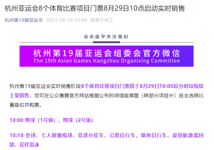 本批次項目上架后,杭州亞運會56個可售項目均已開售。29日上午9:00起,部分項目座席經(jīng)規(guī)劃優(yōu)化后,釋放出的場次門票全部面向公眾銷售,請大家予以關(guān)注。