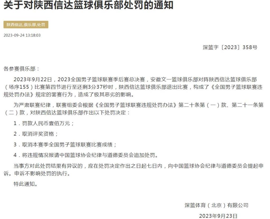 中國籃協(xié)官網(wǎng)公布的“關(guān)于對陜西信達(dá)籃球俱樂部處罰的通知”