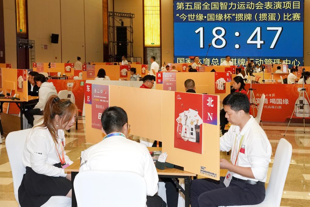 這是摜蛋項目首次進入智運會,比賽設(shè)男子雙人賽、女子雙人賽、混合雙人賽3個競賽項目,執(zhí)行國家體育總局棋牌運動管理中心審定的《競技摜蛋競賽規(guī)則(試行)》,分預(yù)賽、決賽兩個階段進行。預(yù)賽采用場分制瑞士積分編排賽,進行7輪比賽,決賽采用豪威爾制,進行9輪比賽。比賽均采用計算機預(yù)制比賽用牌,全場同牌,以得分決定名次。