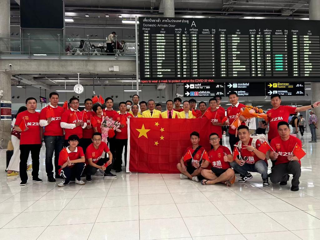 中國球迷在泰國機(jī)場準(zhǔn)備迎接國足抵達(dá)。