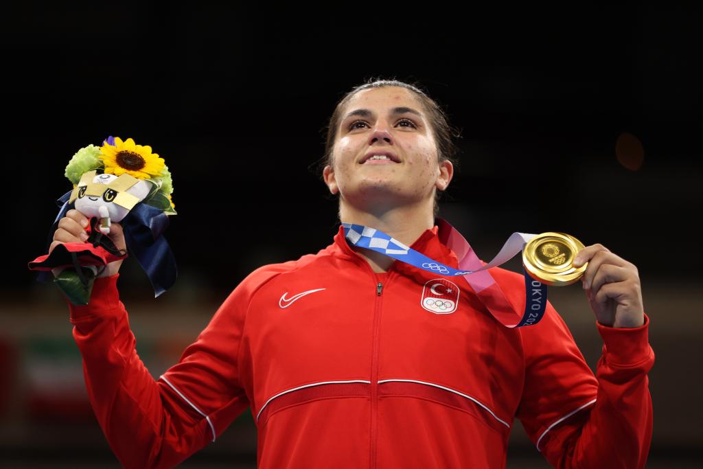 2021年8月7日,獲得冠軍的土耳其選手蘇梅內利在領獎臺上。當日,東京奧運會拳擊女子69公斤級頒獎儀式舉行。新華社記者 歐東衢 攝