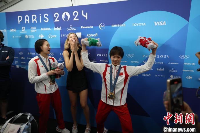 當?shù)貢r間7月31日,在巴黎奧運會跳水女子雙人10米臺項目中,中國隊組合陳芋汐/全紅嬋獲得冠軍。谷愛凌(中)在賽后化身粉絲與陳芋汐(左)、全紅嬋合影。 中新社記者 富田 攝