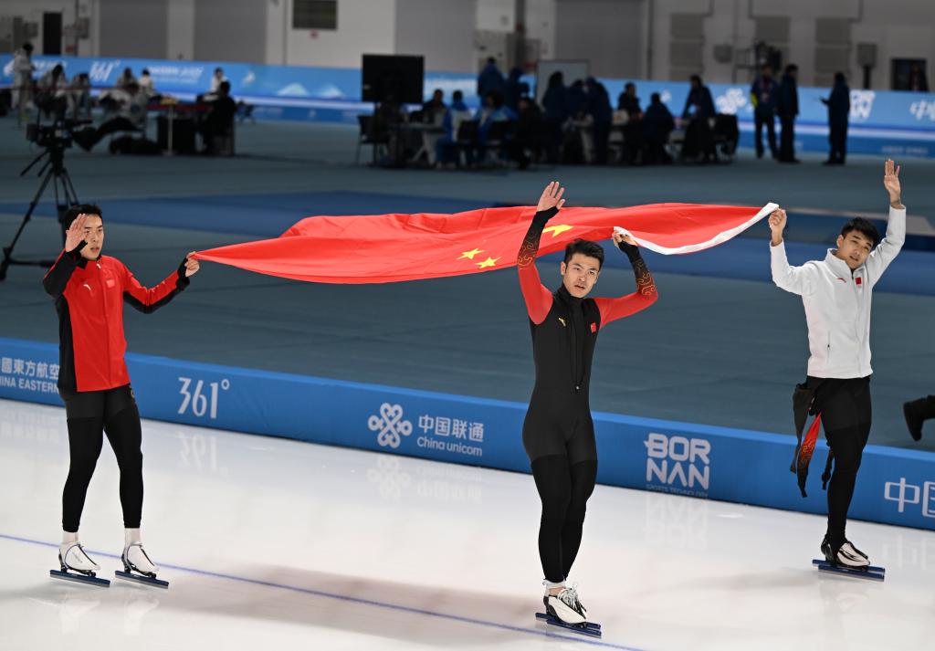 黑龍江省冰上訓(xùn)練中心速滑館里,《義勇軍進行曲》三度奏響。當(dāng)日速度滑冰全部3枚金牌均被中國隊收入囊中。高亭宇先以0.02秒的微弱優(yōu)勢力壓日本選手森重航,奪得男子500米冠軍;又與隊友廉子文、寧忠?guī)r合作,奪得男子短距離團體追逐金牌。女隊則又一次讓三面五星紅旗同時升起,楊濱瑜、韓梅、太智恩分獲女子3000米前三名。本屆亞冬會有三金入賬的高亭宇坦言不知道這會不會是自己最后一屆亞冬會,“(這次)我的關(guān)鍵詞是努力,相信大家一起努力,中國速度滑冰會越來越好”。