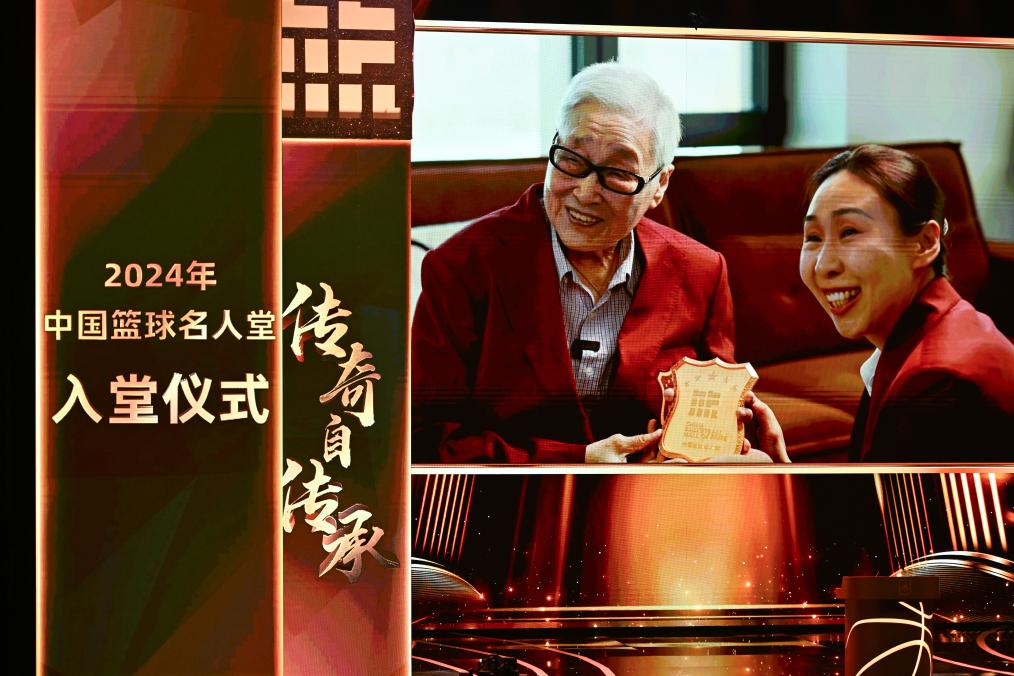 3月23日,入堂儀式上播放中國籃球名人堂入堂人物“杰出女運動員”楊潔(左)領(lǐng)取徽章的視頻。新華社記者 陳鐘昊 攝
