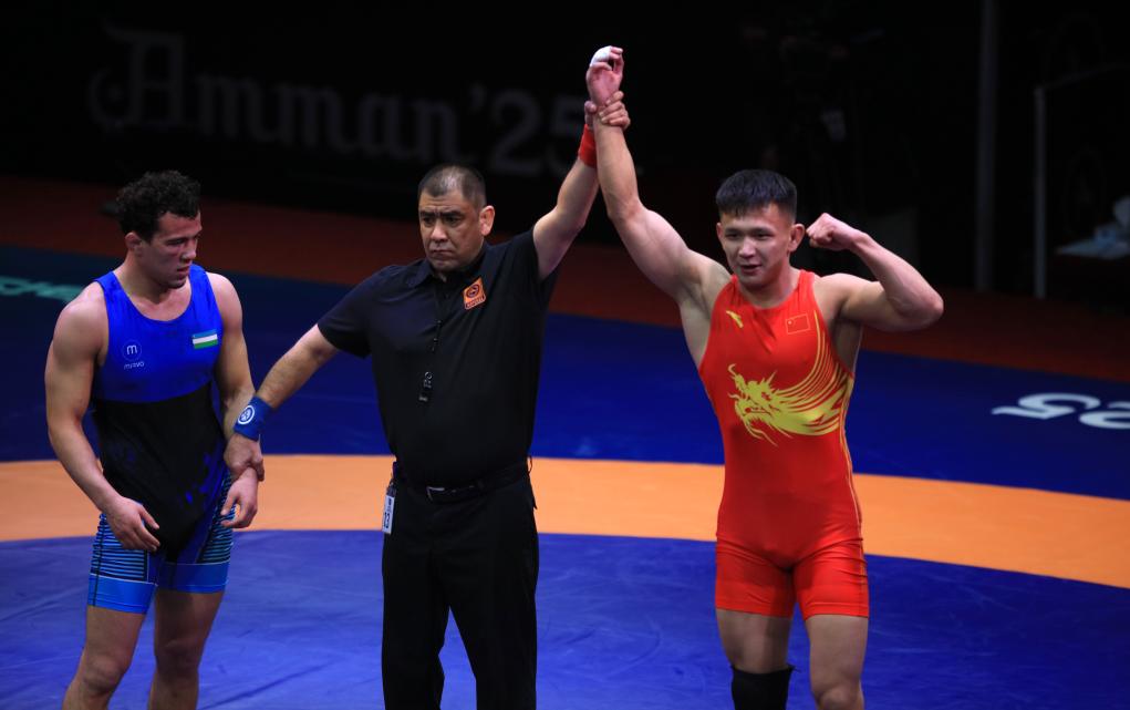 中國(guó)隊(duì)選手鄒萬(wàn)豪在當(dāng)日舉行的男子自由式摔跤61公斤級(jí)銅牌賽中,以4:2戰(zhàn)勝吉爾吉斯斯坦選手梅爾扎納扎爾·吾魯。來(lái)自新疆的阿黑由·吐?tīng)栠d在74公斤級(jí)銅牌賽中,以4:0戰(zhàn)勝烏茲別克斯坦選手納斯?fàn)柼峒局Z夫,為中國(guó)隊(duì)再添一枚銅牌。