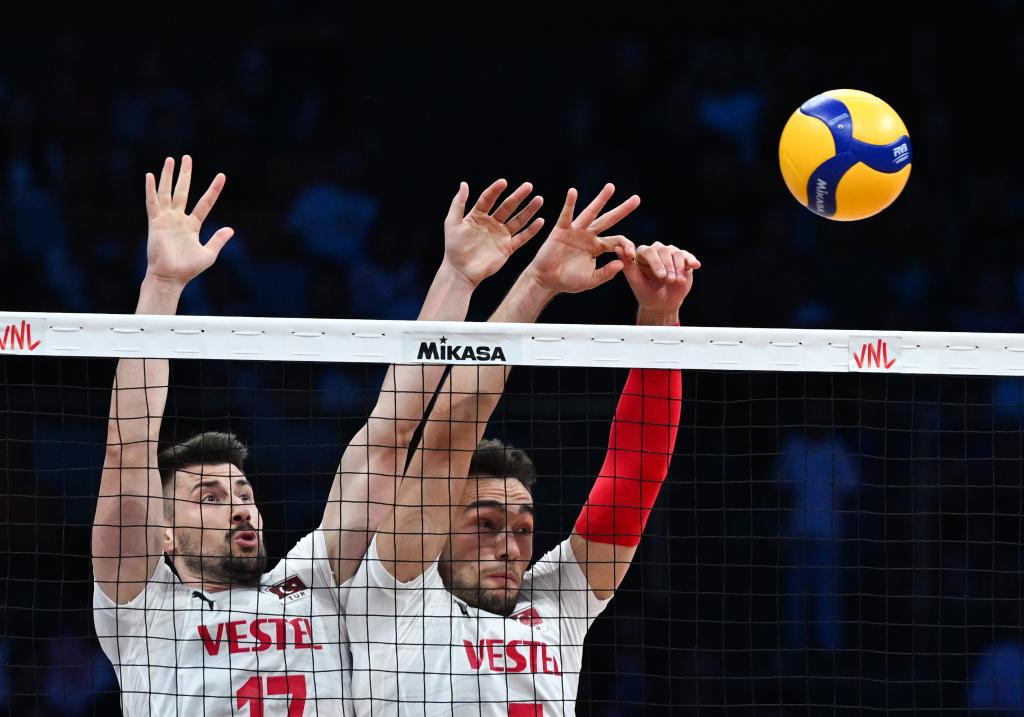 土耳其隊(duì)球員穆拉特·葉尼帕扎爾(左)、貝迪爾汗·比比爾在比賽中攔網(wǎng)。新華社記者 張博文 攝