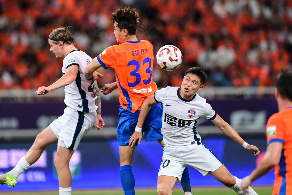 7月27日,山東泰山隊(duì)球員高準(zhǔn)翼(中)在比賽中爭頂。新華社記者 朱崢 攝