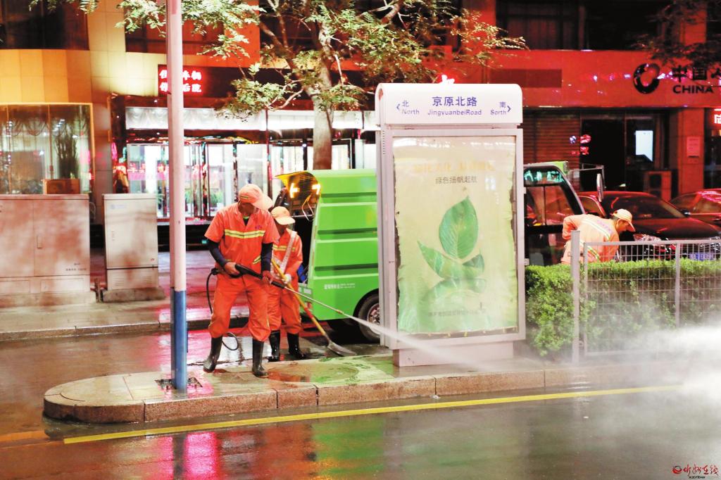 九月九日晚,原平市環(huán)衛(wèi)工人利用晚上路上人少車少的有利時機(jī),清洗京原北路的道路死角。 本報通訊員 攝