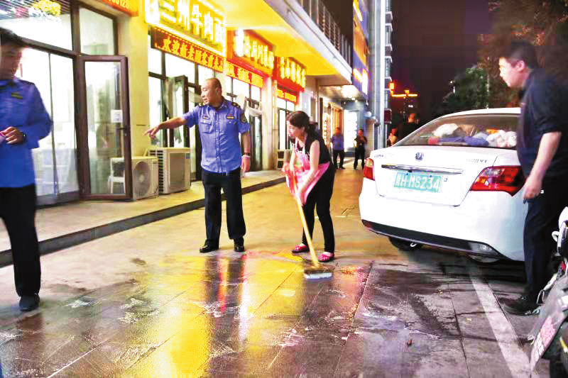 據(jù)了解,此次行動(dòng)共出動(dòng)執(zhí)法人員近30名。通過專項(xiàng)整治,進(jìn)一步規(guī)范了城區(qū)商鋪的經(jīng)營(yíng)秩序,提升了居民的環(huán)保意識(shí)和文明意識(shí),營(yíng)造了和諧文明的市容環(huán)境。圖為執(zhí)法人員與商家一同清理店鋪門前油污。(記者張志遠(yuǎn) 攝影報(bào)道)