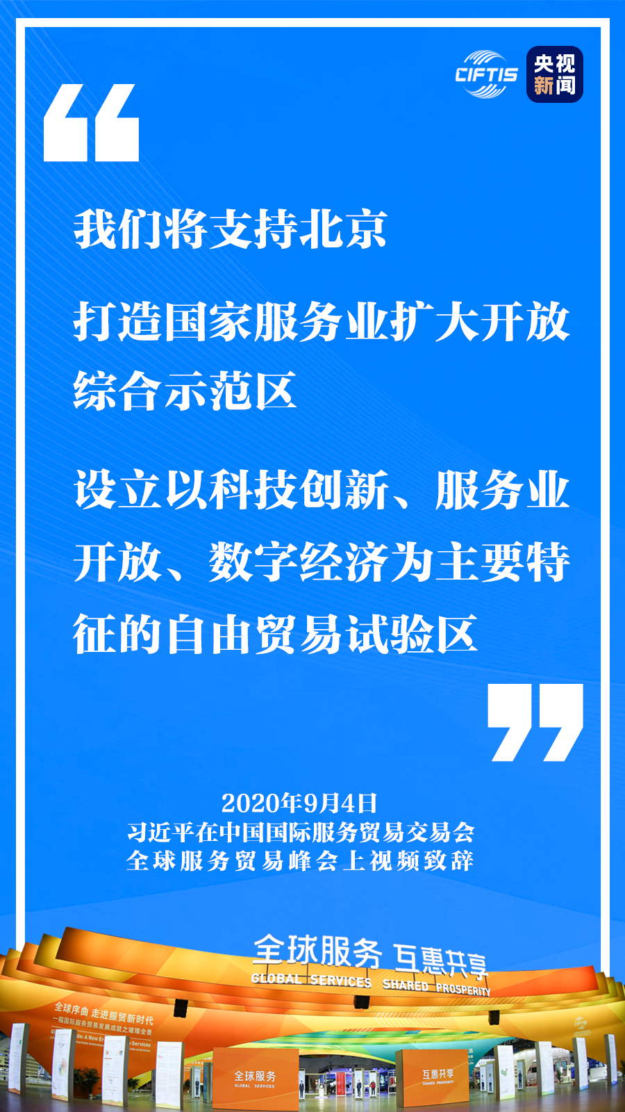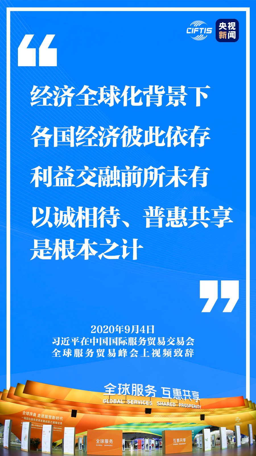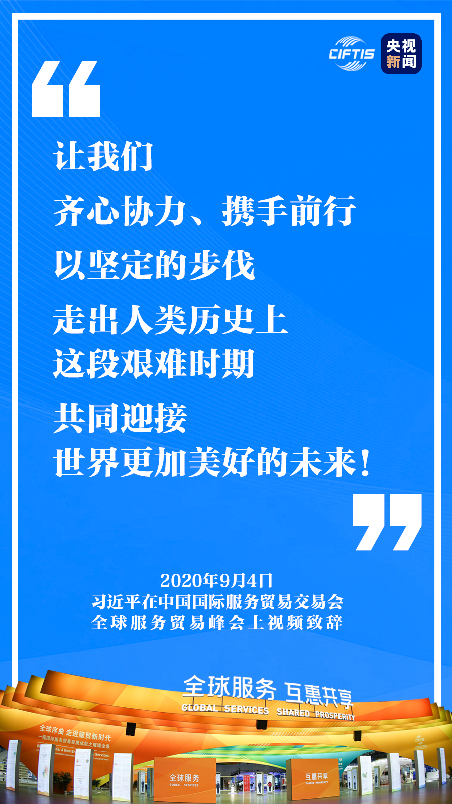 中國(guó)克服重重困難,舉辦這樣一場(chǎng)重大國(guó)際經(jīng)貿(mào)活動(dòng),就是要同大家攜手努力、共克時(shí)艱,共同促進(jìn)全球服務(wù)貿(mào)易發(fā)展繁榮,推動(dòng)世界經(jīng)濟(jì)盡快復(fù)蘇。