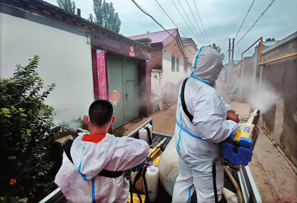 河北涿州發(fā)生暴雨洪澇災(zāi)害后,我市天龍救援隊響應(yīng)號召,攜帶專業(yè)救援設(shè)備迅速奔赴當(dāng)?shù)鼐仍?,大家沖鋒在前,積極投入抽水、排污、清淤、搬運(yùn)物資、消殺等工作中。圖為8月7日在該市刁窩鎮(zhèn),民盟盟員、救援隊隊員王宇龍(右一)和隊友在進(jìn)行街巷消殺。(焦未軍攝)