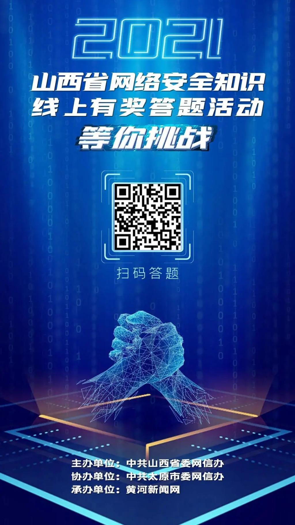 為深入宣傳貫徹《中華人民共和國網(wǎng)絡(luò)安全法》等相關(guān)法律法規(guī),進一步普及網(wǎng)絡(luò)安全知識,提升全社會網(wǎng)絡(luò)安全意識和防護技能,在2021年國家網(wǎng)絡(luò)安全宣傳周期間,由中共山西省委網(wǎng)信辦主辦、中共太原市委網(wǎng)信辦協(xié)辦、黃河新聞網(wǎng)承辦的“2021山西省網(wǎng)絡(luò)安全知識線上有獎答題活動”于10月9日正式啟動。