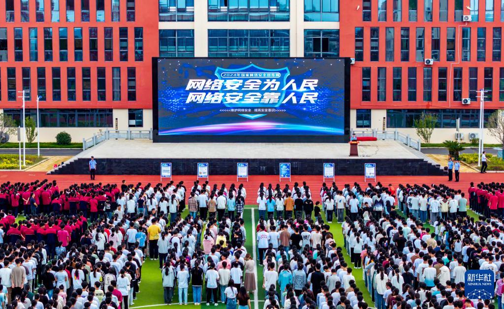 月11日,在貴州省黔西第一中學(xué),公安民警為學(xué)生講解網(wǎng)絡(luò)安全知識(無人機照片)。(新華社發(fā) 范暉 攝)