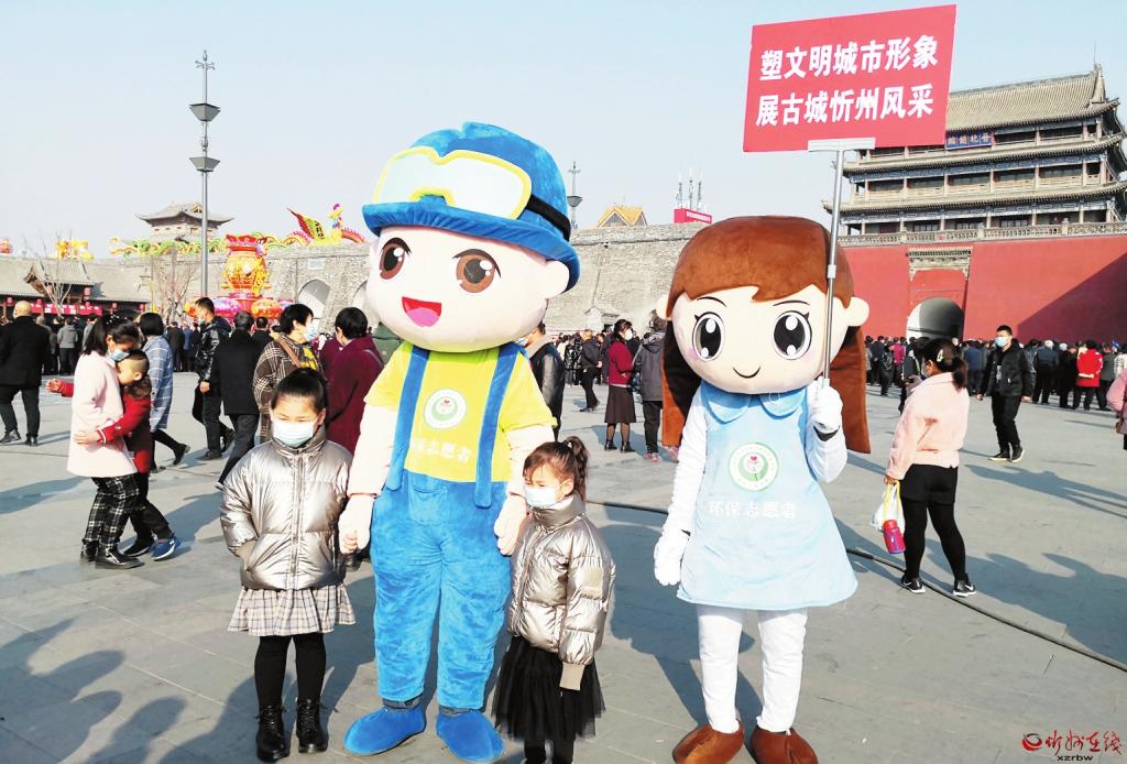 2月26日,農(nóng)歷辛丑年元宵節(jié),忻州古城北城門樓廣場上,兩名卡通形象裝扮的環(huán)保志愿者向群眾宣傳環(huán)保政策法規(guī),倡導(dǎo)環(huán)保過節(jié)、文明旅游。為豐富和活躍群眾文化生活,展現(xiàn)忻州古城保護(hù)活化新成就,元宵節(jié)期間,忻州古城舉行了社火游行,吸引了廣大市民。忻州市環(huán)保志愿者協(xié)會借機(jī)組織了環(huán)保宣傳活動(dòng)。 (張劍雄 攝)