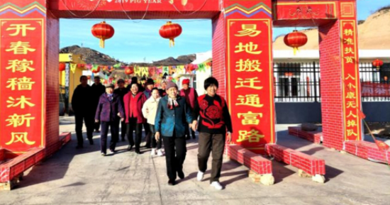 大峪坪易地搬遷點是晉中市太谷區(qū)完成整村搬遷入住的第一村,春節(jié)前夕,村兩委班子張羅著將小區(qū)布置一新,大門口制作了喜慶醒目的迎春牌樓,牌樓兩側(cè)寫有群眾自編的新春聯(lián),上聯(lián)是:開春稼穡沐新風(fēng),下聯(lián)是:易地搬遷通富路。東側(cè)的門柱上寫著:精準扶貧,入小康無人掉隊。