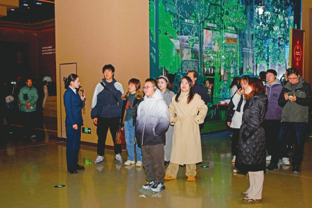 2月8日,運(yùn)城市河?xùn)|歷史文化展示中心內(nèi),游客正在數(shù)字互動(dòng)屏幕前駐足查看歷史資料。楊晨玉攝