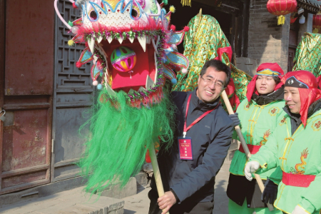 臨汾記者站記者郭玉琴(左二)在臨汾市水門街采訪“洋媳婦”扎拉過(guò)中國(guó)年。