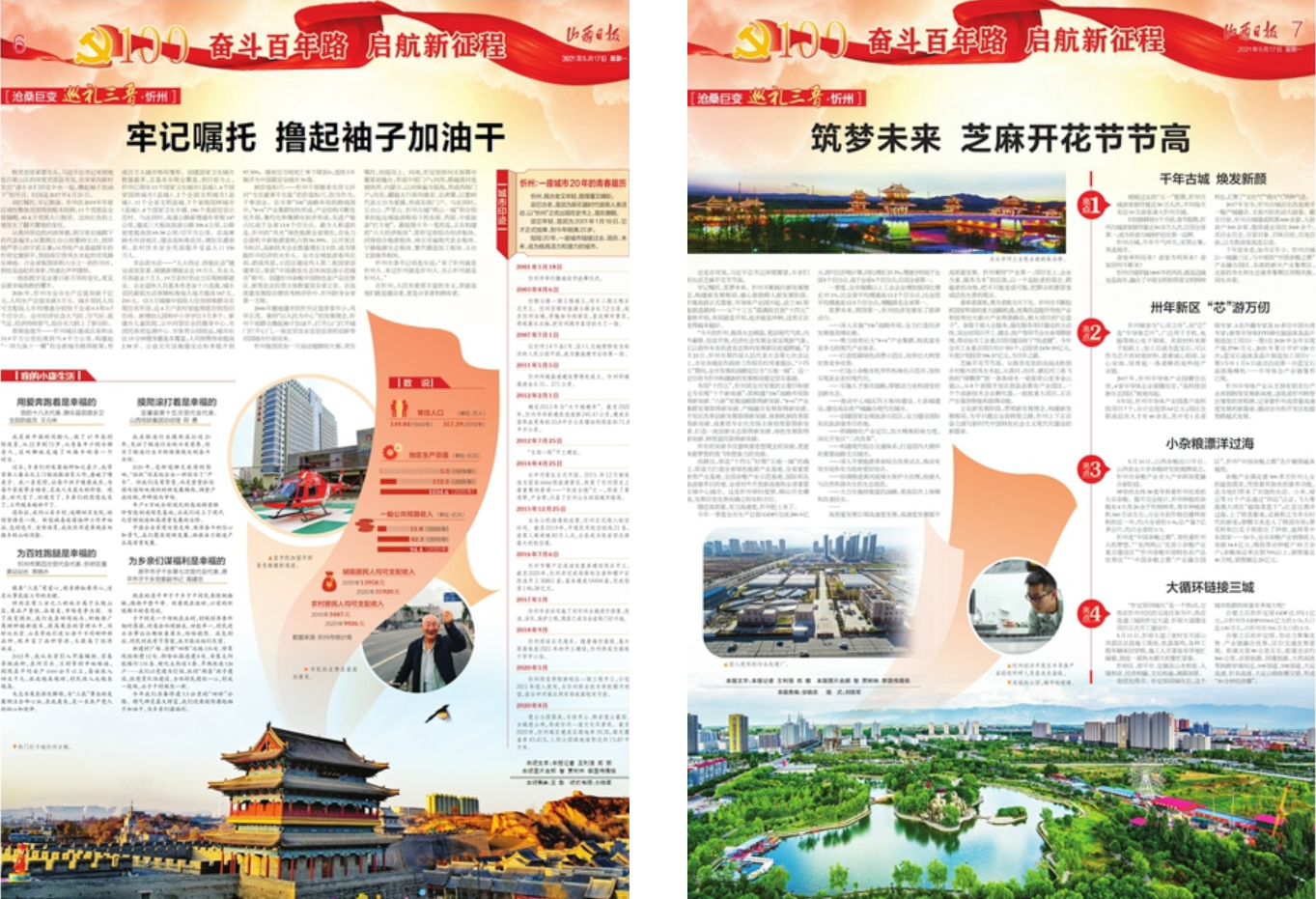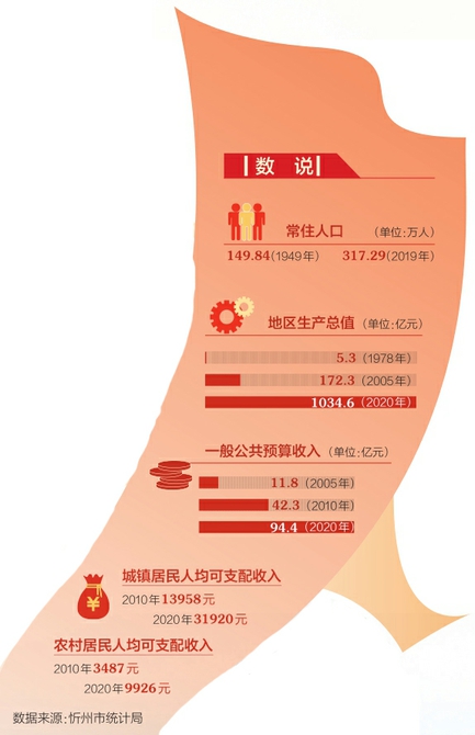 熱門打卡地忻州古城。 脫貧攻堅(jiān)緊要關(guān)頭,習(xí)近平總書記來(lái)到地處呂梁山區(qū)的深度貧困縣岢嵐,在宋家溝新村發(fā)出“請(qǐng)鄉(xiāng)親們同黨中央一起,擼起袖子加油干”的號(hào)召。時(shí)間是2017年6月21日。 肩扛囑托,牢記教誨。忻州在2019年年底區(qū)域性整體貧困得到根本扭轉(zhuǎn),11個(gè)貧困縣全部摘帽,45.4萬(wàn)貧困人口脫貧。這塊紅色的土地發(fā)生了翻天覆地的變化。 從黃河岸邊的河曲保德,到萬(wàn)里長(zhǎng)城腳下的代縣偏關(guān);從簇?fù)砦迮_(tái)山的繁峙五臺(tái),到環(huán)繞蘆芽山的寧武五寨;從傳統(tǒng)產(chǎn)業(yè)基礎(chǔ)厚實(shí)的忻府定襄原平,到招商引資風(fēng)生水起的岢嵐靜樂(lè)神池。占全省版圖面積六分之一的忻州市,到處是追趕的身影,傳遞出聲聲捷報(bào)。 一組組數(shù)字見(jiàn)證著日新月異的變化,更見(jiàn)證著幸福指數(shù)的攀升。 2020年,忻州市全市生產(chǎn)總值突破千億元,人均生產(chǎn)總值突破3萬(wàn)元。城鄉(xiāng)居民人均可支配收入年均增速分別快于全省0.3和0.7個(gè)百分點(diǎn)。全市經(jīng)濟(jì)社會(huì)人氣旺、空氣好、底氣足、經(jīng)濟(jì)持續(xù)景氣,綜合實(shí)力躍上了新臺(tái)階。 看顏值提升——忻州城區(qū)建成區(qū)面積由33.9平方公里拓展到71.8平方公里,構(gòu)建起“一環(huán)九縱十一橫”的全新城市路網(wǎng)框架,形成百萬(wàn)人城市格局雛形。創(chuàng)建國(guó)家衛(wèi)生城市數(shù)量最多,且基本實(shí)現(xiàn)全覆蓋,到目前為止,忻州已擁有13個(gè)國(guó)家衛(wèi)生城市(縣城)、4個(gè)國(guó)家園林城市(縣城)、2個(gè)全國(guó)文明城市(縣城)、11個(gè)全省文明縣城、7個(gè)省級(jí)園林城市(縣城)、8個(gè)國(guó)家衛(wèi)生鄉(xiāng)鎮(zhèn)、186個(gè)美麗宜居示范村。與此同時(shí),高速公路新增通車?yán)锍?47公里,建成三大板塊旅游公路358.4公里,公路密度提高到69.38公里/百平方公里。在高寒缺水冷涼地區(qū),建設(shè)高標(biāo)準(zhǔn)農(nóng)田,增加實(shí)灌面積,農(nóng)村飲水安全鞏固提升受益人口156萬(wàn)人。 享品質(zhì)生活——“人人持證、技能社會(huì)”建設(shè)成效顯著,城鎮(zhèn)新增就業(yè)近19萬(wàn)人、失業(yè)人員再就業(yè)7萬(wàn)人、19萬(wàn)農(nóng)村勞動(dòng)力實(shí)現(xiàn)轉(zhuǎn)移就業(yè)。企業(yè)退休人員基本養(yǎng)老金十六連漲,城鄉(xiāng)居民最低生活保障標(biāo)準(zhǔn)每人每月提高167元、210元。12.3萬(wàn)城鎮(zhèn)中低收入住房困難群眾實(shí)現(xiàn)住有所居,近4萬(wàn)戶農(nóng)村家庭徹底告別危舊住房。新增幼兒園和中小學(xué)學(xué)位3萬(wàn)多個(gè)。新建市兒童醫(yī)院、云中河景區(qū)全民健身中心、市國(guó)民體質(zhì)監(jiān)測(cè)中心、市體育公園投運(yùn),城市社區(qū)15分鐘健身圈基本覆蓋,人均預(yù)期壽命提高2.38歲。公益文化設(shè)施建設(shè)達(dá)標(biāo)率提升到97.39%。煤炭百萬(wàn)噸死亡率下降到0,連續(xù)3年被評(píng)為中國(guó)最安全城市30強(qiáng)。 樹價(jià)值標(biāo)尺——忻州干部繼承先賢元好問(wèn)“為官避事平生恥”的價(jià)值標(biāo)尺,擔(dān)當(dāng)作為,干事創(chuàng)業(yè)。在市委“336”戰(zhàn)略布局的路線圖中,“8+6”產(chǎn)業(yè)集群加快形成,產(chǎn)業(yè)結(jié)構(gòu)不斷優(yōu)化升級(jí),集約化和集群化初步形成,先進(jìn)產(chǎn)能占比高于全省13.8個(gè)百分點(diǎn)。最為人稱道的是,忻州的“風(fēng)光”綠色能源全省領(lǐng)先,在電力總裝機(jī)中新能源裝機(jī)占到56.59%。以開發(fā)區(qū)為標(biāo)識(shí),高新技術(shù)企業(yè)數(shù)量增長(zhǎng)2.3倍,成為領(lǐng)跑忻州經(jīng)濟(jì)的火車頭。全市全域旅游春風(fēng)化雨,蔚成風(fēng)景,示范區(qū)建設(shè)列入第二批國(guó)家創(chuàng)建單位,榮獲“中國(guó)最佳生態(tài)休閑旅游示范城市”稱號(hào)。創(chuàng)建忻州雜糧中國(guó)特色農(nóng)產(chǎn)品優(yōu)勢(shì)區(qū),新型農(nóng)業(yè)經(jīng)營(yíng)主體數(shù)量居全省之首。在高質(zhì)量發(fā)展綜合績(jī)效考核評(píng)價(jià)中,忻州躋身全省第一方陣。 2000年撤地建市的忻州正值青春年少,風(fēng)華正茂。秉持“以人民為中心”的發(fā)展理念,忻州干部群眾擼起袖子加油干,打開山門打開城門打開心門,一座宜居宜業(yè)宜創(chuàng)宜游的創(chuàng)新型田園城市撲面而來(lái)。 忻州版圖猶如一只扇動(dòng)翅膀的大雁,背負(fù)囑托,扶搖而上。向南,忻定原面向太原都市圈緊密融合,形成中部門戶;向西,跨越黃河連接陜西、內(nèi)蒙古,以河保偏為弧線,形成西部門戶;向東,翻越太行面向雄安、京津冀,以繁峙代縣五臺(tái)為重鎮(zhèn),形成東部門戶。與此同時(shí),五臺(tái)山、蘆芽山、忻州古城“兩山一城”則分別承擔(dān)起全域旅游格局下的東部、西部、中部旅游“打卡地”。最值得大書一筆的是,正在構(gòu)建的“六大經(jīng)濟(jì)板塊”,即忻定原綜合經(jīng)濟(jì)板塊、河保綜合能源板塊、神五岢偏現(xiàn)代農(nóng)業(yè)板塊、寧?kù)o能源生態(tài)板塊、繁代鍛造加工板塊、五臺(tái)文旅康養(yǎng)板塊。 忻州市委書記鄭連生說(shuō):“來(lái)了忻州就是忻州人、來(lái)過