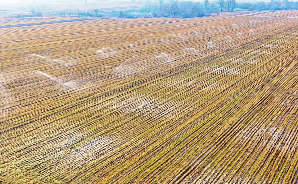 2月28日,臨汾市襄汾縣鄧莊鎮(zhèn)澗溝村,農(nóng)民采用智能水肥一體化技術(shù)對麥田進(jìn)行噴灌作業(yè)。李現(xiàn)俊攝