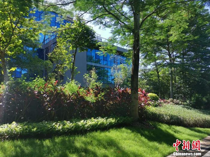 海南生態(tài)軟件園園區(qū)內(nèi)被綠樹(shù)掩映。中新網(wǎng)記者 謝藝觀 攝
