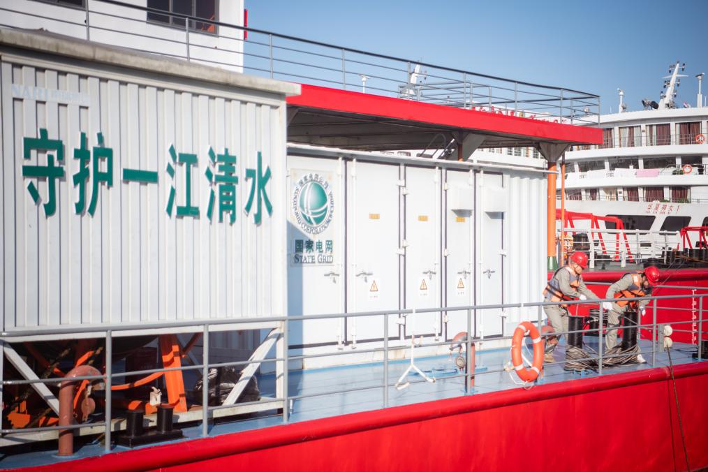 8月4日,國家電網(wǎng)宜昌供電公司岸電運維人員在秭歸港供電躉船查看岸電系統(tǒng)專用接地線運行狀態(tài)。新華社記者伍志尊 攝