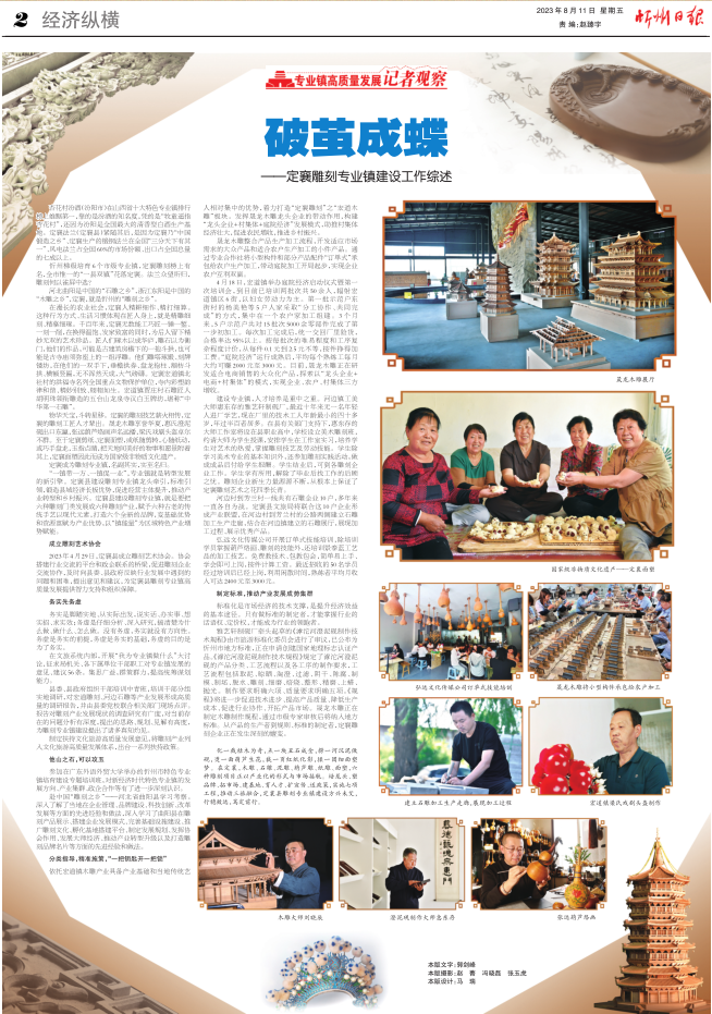 “一鎮(zhèn)帶一方、一鎮(zhèn)促一業(yè)”,專業(yè)鎮(zhèn)就是轉(zhuǎn)型發(fā)展的新引擎。定襄縣建設(shè)雕刻專業(yè)鎮(zhèn)龍頭牽引,標(biāo)準(zhǔn)引領(lǐng),鍛造縣域經(jīng)濟(jì)長板優(yōu)勢,促進(jìn)經(jīng)營主體提升,推動產(chǎn)業(yè)轉(zhuǎn)型和鄉(xiāng)村振興。定襄縣建設(shè)雕刻專業(yè)鎮(zhèn),就是要把六種雕刻門類發(fā)展成六種雕刻產(chǎn)業(yè),賦予六種古老的傳統(tǒng)手藝以現(xiàn)代元素,打造六個全新的品牌,變基礎(chǔ)優(yōu)勢和資源稟賦為產(chǎn)業(yè)優(yōu)勢,以“鎮(zhèn)能量”為區(qū)域特色產(chǎn)業(yè)增勢賦能。