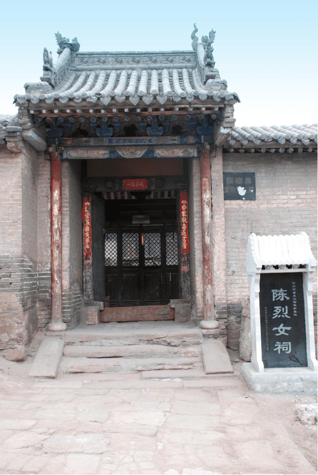 陳烈女祠坐西向東,為二進(jìn)院落布局。占地面積685平方米。大門(mén)一座,前院過(guò)殿面寬三間,單檐硬山頂;南北配殿各面寬三間,單檐硬山頂。后院正殿面寬三間,單檐硬山頂,前設(shè)小抱廈;后院正殿內(nèi)供奉陳烈女塑像。祠內(nèi)存有明崇禎七年(1634)“圣旨(復(fù)制品)”一道,新繪壁畫(huà)16平方米。2007年6月,陳烈女祠被忻州市人民政府公布為市級(jí)文物保護(hù)單位。