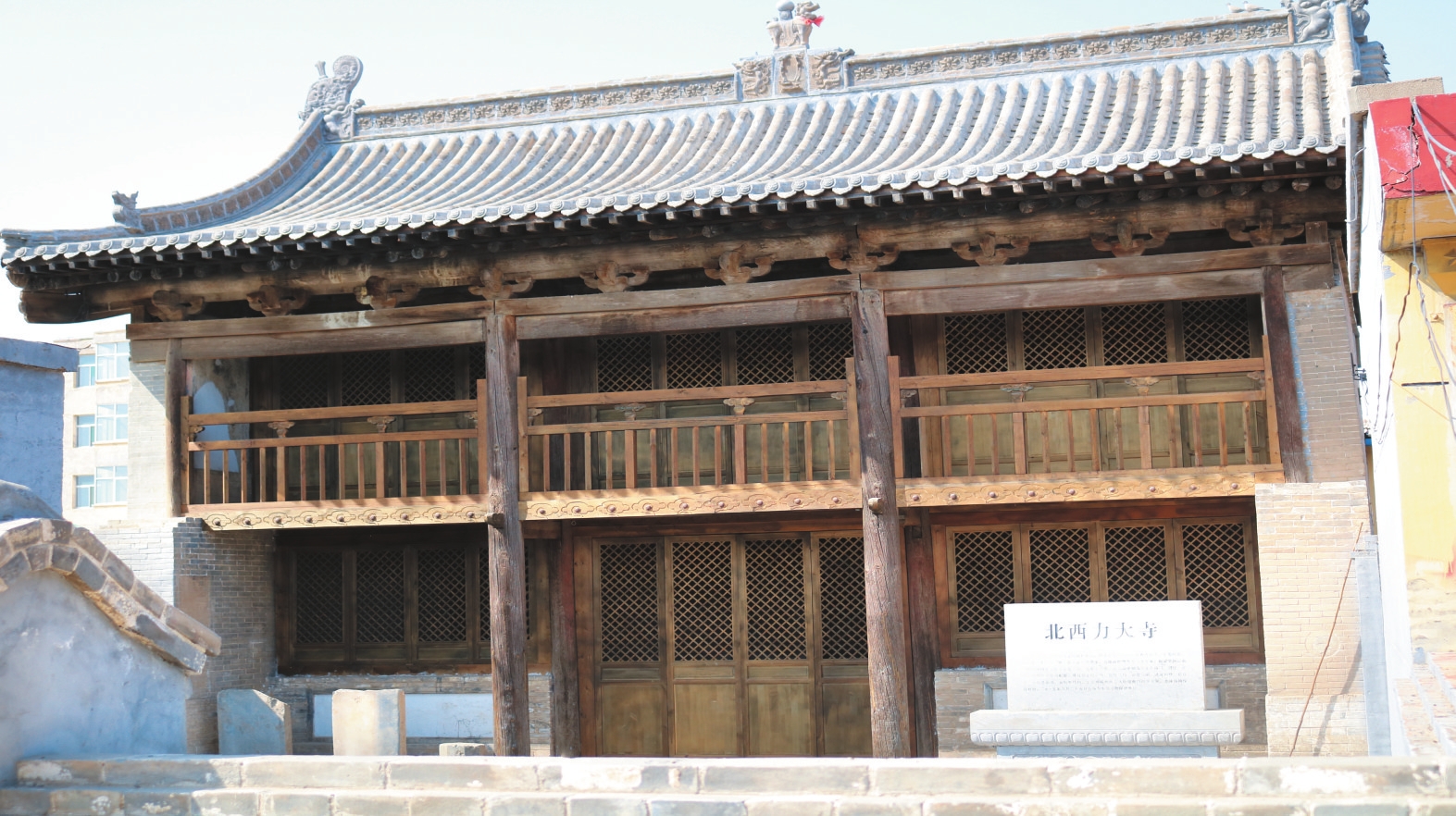 北西力大寺位于定襄縣晉昌鎮(zhèn)北西力村中,坐北朝南,東西長11.1米、南北寬8.4米,占地面積約93平方米。據(jù)梁架題記記載為明萬歷四十三年(1615)所建。該寺沿中軸線原建有山門、過廳、正殿,兩側(cè)建有東西配房?,F(xiàn)僅存正殿,為二層樓閣式結(jié)構,面寬三間,進深四椽,前設廊,單檐懸山頂,五檁架結(jié)構。二層廊前兩側(cè)有人物壁畫約4平方米。2015年8月25日公布為市級文物保護單位。