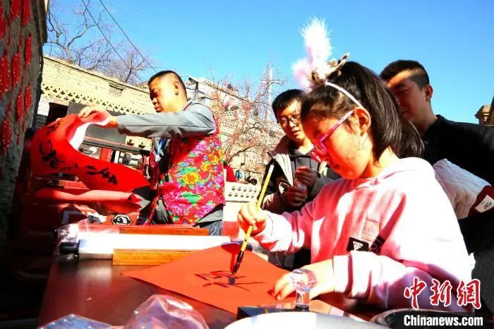 舞獅表演者為前來圍觀的民眾送上新春祝福。白鵬偉 攝 為了彰顯中國傳統(tǒng)“年味”,張家塔村還開展了“萬人送福 福至萬家”書法活動、“龍騰‘?!S”民俗匯、“牛娃”故事匯、“福至萬家”燈展、牧牧新春音樂會、“五谷豐登”美食匯、“獨具匠心”非遺展、“萌寵”獻(xiàn)福等8項富有張家塔元素的主題活動,讓游客在感受傳統(tǒng)文化和年俗文化中,對傳統(tǒng)古村落張家塔有更多了解。