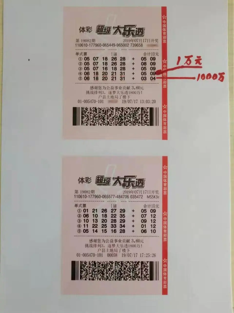 兩張彩票其中一張中獎(jiǎng),一組號(hào)碼中獎(jiǎng)1萬元,另一組號(hào)碼中獎(jiǎng)1000萬元