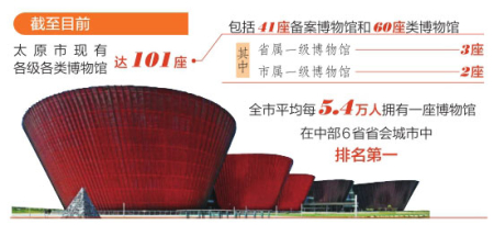 太原市充分發(fā)揮文物資源優(yōu)勢(shì),將博物館作為文物保護(hù)利用改革的突破口,傾力建設(shè)凸顯地方文化特色的“博物館之城”。截至目前,太原市現(xiàn)有各級(jí)各類博物館達(dá)101座,包括41座備案博物館和60座類博物館,其中省屬一級(jí)博物館3座、市屬一級(jí)博物館2座。全市平均每5.4萬人擁有一座博物館,在中部6省省會(huì)城市中排名第一,遠(yuǎn)超全國(guó)平均水平。