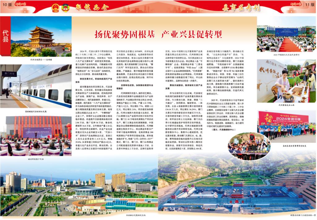 轉(zhuǎn)變發(fā)展方式,積極構(gòu)筑現(xiàn)代產(chǎn)業(yè)體系面對繁重的改革發(fā)展任務(wù),代縣著眼全局,立足實際,堅持健全因地制宜發(fā)展新質(zhì)生產(chǎn)力體制機(jī)制,把構(gòu)筑涉鐵全產(chǎn)業(yè)鏈、黃酒產(chǎn)業(yè)、特優(yōu)種養(yǎng)、農(nóng)產(chǎn)品精深加工、現(xiàn)代旅游康養(yǎng)、非遺文化、新能源、現(xiàn)代服務(wù)“八大產(chǎn)業(yè)支撐體系”作為加快縣域經(jīng)濟(jì)轉(zhuǎn)型升級的重要路徑,著力增強(qiáng)高質(zhì)量發(fā)展后勁和支撐。培育達(dá)限達(dá)規(guī)重點企業(yè)10戶、“專精特新”企業(yè)2戶,非煤礦山企業(yè)整治整合重組穩(wěn)步推進(jìn);改造提升及新建高標(biāo)準(zhǔn)農(nóng)田2.98萬畝,推廣優(yōu)種38萬畝,糧食機(jī)耕面積34.8萬畝,全年糧食產(chǎn)量2.34億斤,特優(yōu)種養(yǎng)全面鋪開;農(nóng)業(yè)產(chǎn)業(yè)化省級重點龍頭企業(yè)突破至6家,“代縣小米”獲得農(nóng)產(chǎn)品地理標(biāo)志認(rèn)證,縣級以上龍頭企業(yè)營業(yè)收入4.31億元,增幅29.8%;26家非遺工坊綜合產(chǎn)值達(dá)6億元,非遺文化產(chǎn)業(yè)多點開花、聯(lián)動發(fā)展;全縣投入運(yùn)營和正在建設(shè)中的新能源產(chǎn)業(yè)項目裝機(jī)總?cè)萘窟_(dá)2670MW,農(nóng)村電商公共服務(wù)、物流配送、電商銷售等體系建設(shè)加快推進(jìn),配備云監(jiān)控及數(shù)據(jù)可視化系統(tǒng)的代縣電商物流倉儲分揀中心建成投用;集大原高鐵雁門關(guān)站開通,“雁門關(guān)號”列車冠名首發(fā),群眾出行更加便捷。產(chǎn)城融合、數(shù)字賦能等轉(zhuǎn)型變量疊加集聚,代縣經(jīng)濟(jì)在承壓前行中展現(xiàn)出強(qiáng)大韌性,呈現(xiàn)出筑底企穩(wěn)、回升向好的發(fā)展態(tài)勢。