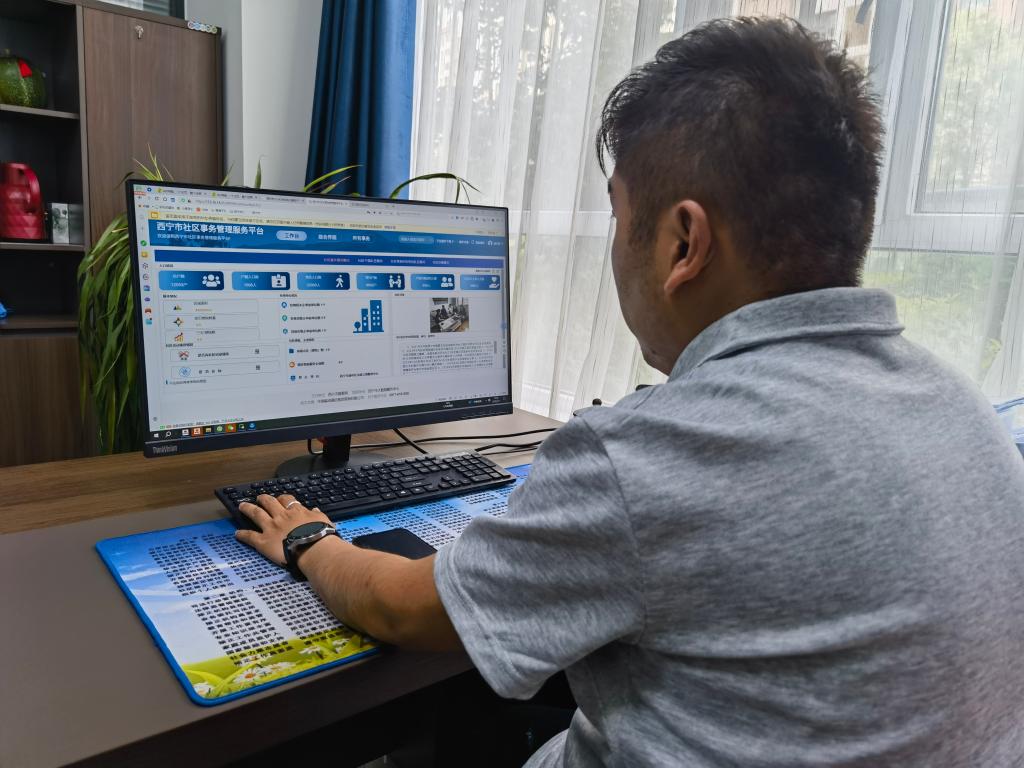 7月7日,青海省西寧市城中區(qū)南川西路街道安寧路社區(qū)工作人員正在操作社區(qū)事務(wù)管理服務(wù)平臺(tái)。新華社記者 柳澤興 攝
