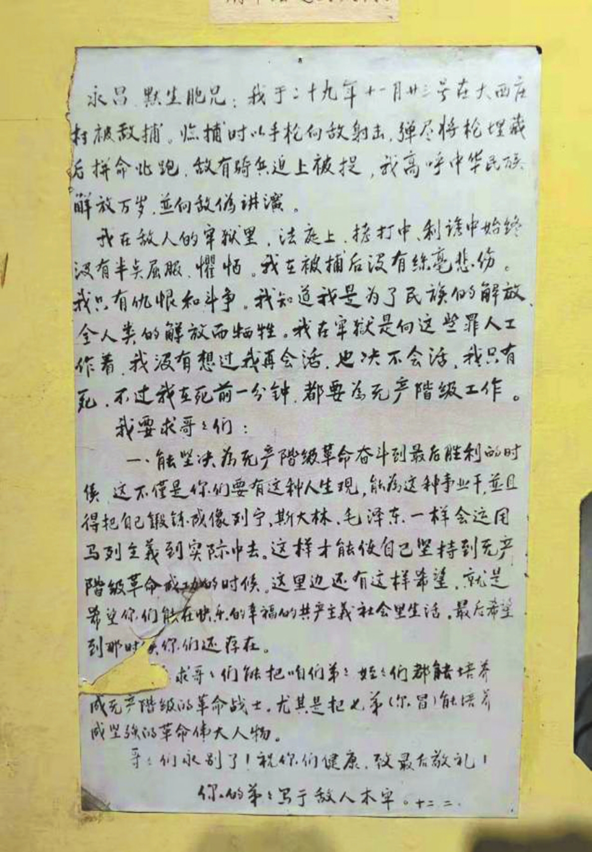 在此彌留之際,我以畢生至誠敬謹請求入黨,請中共中央嚴格審查我的一生歷史,是否合格,如承追認入黨,實平生之大愿也,專此謹致布爾塞維克的敬禮!