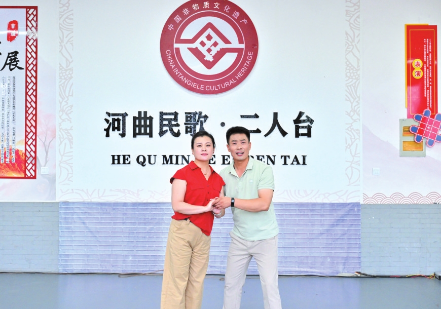 走進(jìn)河曲縣白樸公園,一段清亮婉轉(zhuǎn)的唱腔便隨風(fēng)入耳——河曲縣民歌二人臺(tái)藝術(shù)團(tuán)演員鄔光正和同事們?nèi)橥度耄蚰ゴ笮头沁z音樂劇《大河長(zhǎng)歌》。他額角滲著細(xì)密的汗珠,當(dāng)唱到“好兒女今日唱長(zhǎng)歌,勝過了前輩了不得”時(shí),突然停了下來,對(duì)搭檔說:“再來一遍,剛才那口氣沒頂滿。”這份對(duì)細(xì)節(jié)的較真,藏著他對(duì)二人臺(tái)藝術(shù)最樸素也最深厚的敬畏。