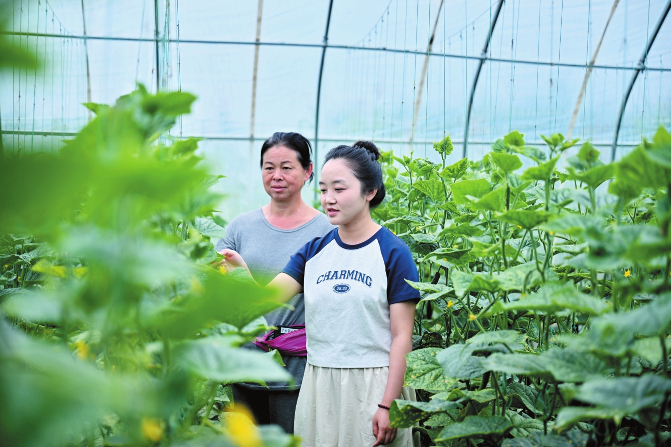 保德縣暖泉村駐村大學生正在觀察黃瓜長勢。本報記者 馮曉磊攝