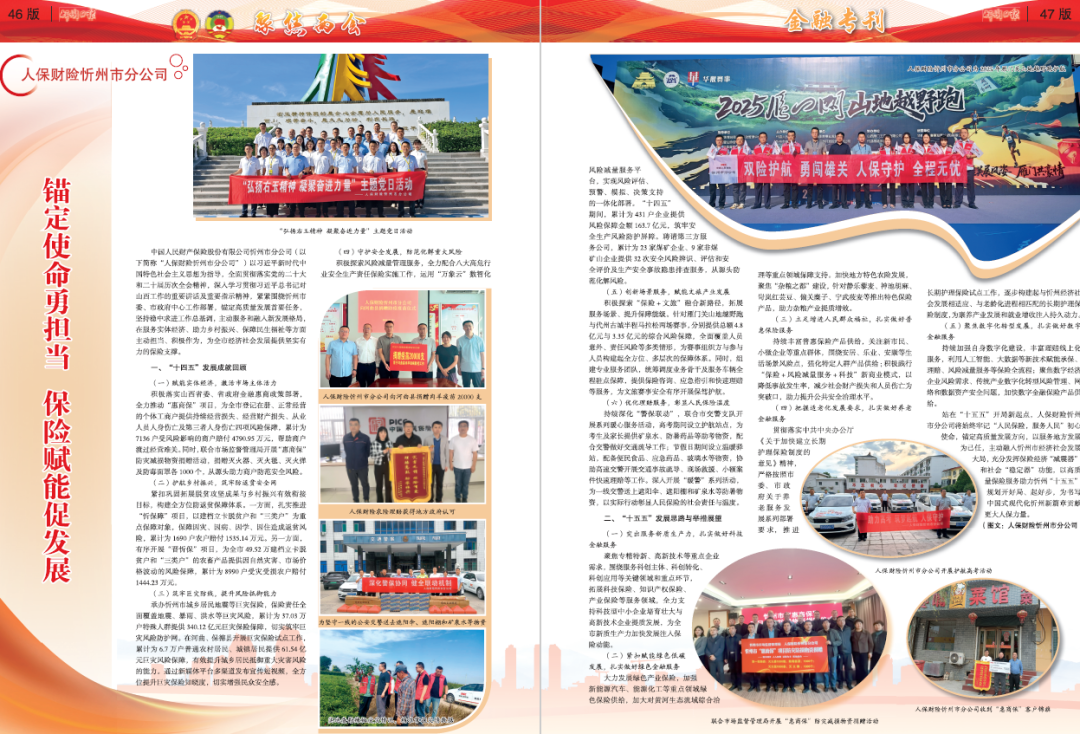 中國人民財產(chǎn)保險股份有限公司忻州市分公司(以下簡稱“人保財險忻州市分公司”)以習近平新時代中國特色社會主義思想為指導,全面貫徹落實黨的二十大和二十屆歷次全會精神,深入學習貫徹習近平總書記對山西工作的重要講話及重要指示精神,緊緊圍繞忻州市委、市政府中心工作部署,錨定高質(zhì)量發(fā)展首要任務,堅持穩(wěn)中求進工作總基調(diào),主動服務和融入新發(fā)展格局,在服務實體經(jīng)濟、助力鄉(xiāng)村振興、保障民生福祉等方面主動擔當、積極作為,為全市經(jīng)濟社會發(fā)展提供堅實有力的保險支撐。